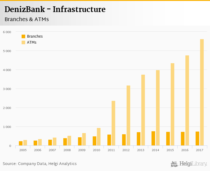 Comparing DenizBank with its closest peers, Isbank operated a network of 1,364 branches and 6,557 ATMs in 2017, Garanti Bank had 948 branches and 5,003 ATMs and VakifBank had a network of 927 branches with 4,037 ATMs in 2017.