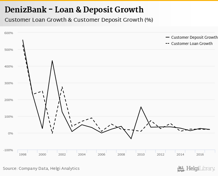 DenizBank's customer loan growth reached 21.1% in 2017, down from 22.0% compared to the previous year. Historically, the bank’s loans growth reached an all time high of 526% in 1998 and an all time low of -2.95% in 2001. In the last decade, the average annual loan growth amounted to 26.9%.
