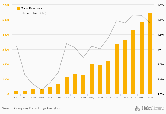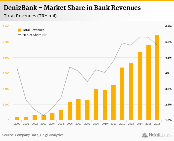 As a result, DenizBank accounted for 5.41% of all bank revenues generated by banks in Turkey in 2016. Historically, the bank’s market share in total revenues reached an all time high of 5.85% in 2014 and an all time low of 1.83% in 2003.