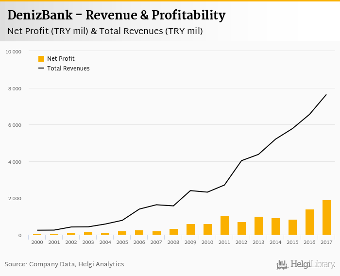 Comparing DenizBank with its closest peers, Isbank generated a net profit of TRY 5,749 mil with revenues of TRY 23,321 mil in 2017, Garanti Bank netted TRY 6,388 mil (revenues of TRY 19,655 mil) and VakifBank announced a net profit of TRY 3,910 mil (revenues of TRY 12,509 mil).