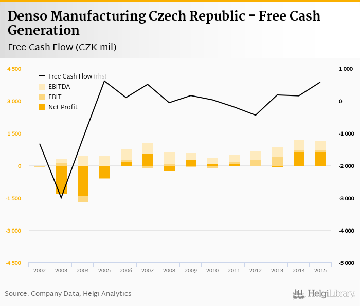 Denso Manufacturing Czech Republic made a net profit of CZK 623 mil with revenues of CZK 12,363 mil in 2015, up by 1.08% and up by 6.85%, respectively, compared to the previous year. This translates into a net margin of 5.04%.