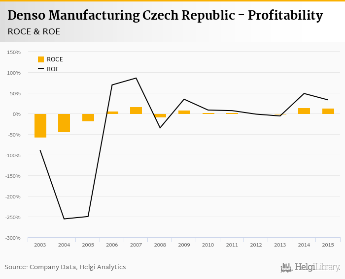 As far as Denso Manufacturing Czech Republic's peers are concerned, Varroc Lighting Systems Czech Republic generated ROE of 28.0% and ROCE of 17.8% in 2015. Automotive Lighting's profitability reached 46.9% and 47.7%, respectively. Continental Automotive Czech Republic operated with 7.08% and 2.02% returns in 2015.