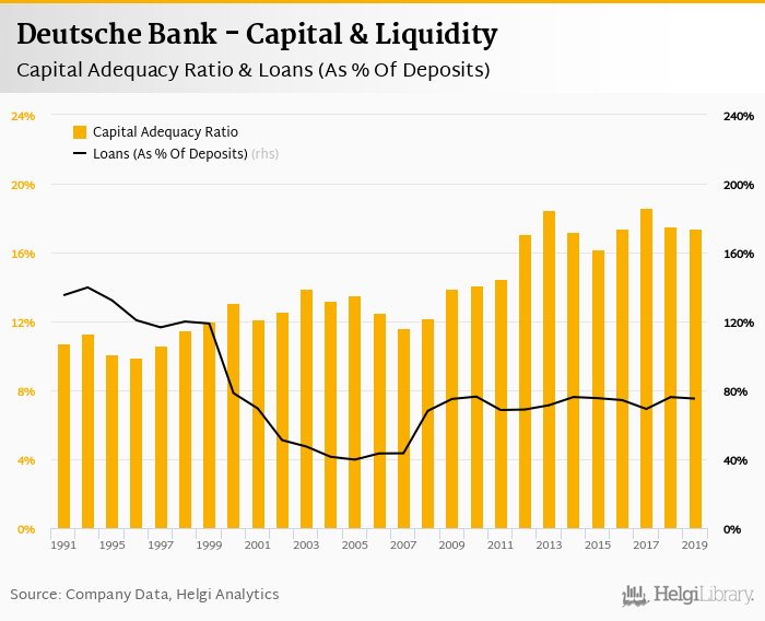 Deutsche Bank's capital adequacy ratio reached 17.4% at the end of 2019, down from 17.5% compared to the previous year. Historically, the bank’s capital ratio hit an all time high of 18.6% in 2017 and an all time low of 9.90% in 1996.