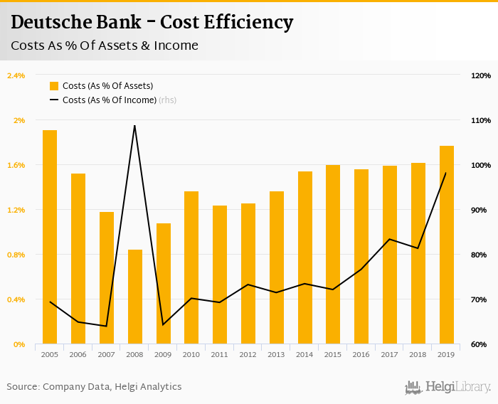 Deutsche Bank's cost to income ratio reached 98.2% in 2019, up from 81.3% compared to the previous year.