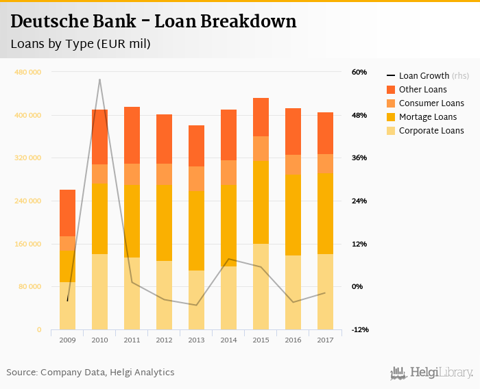 Deutsche Bank's loans reached EUR 405,621 mil in the 2017, down from EUR 413,455 mil compared to the previous year. Historically, the bank’s loans reached an all time high of EUR 432,778 mil in 2015 and an all time low of EUR 261,448 mil in 2009.
