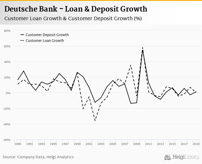Deutsche Bank's customer loan growth reached 0.156% in 2019, down from 6.88% compared to the previous year. Historically, the bank’s loans growth reached an all time high of 58.0% in 2010 and an all time low of -35.6% in 2002. In the last decade, the average annual loan growth amounted to 5.24%.