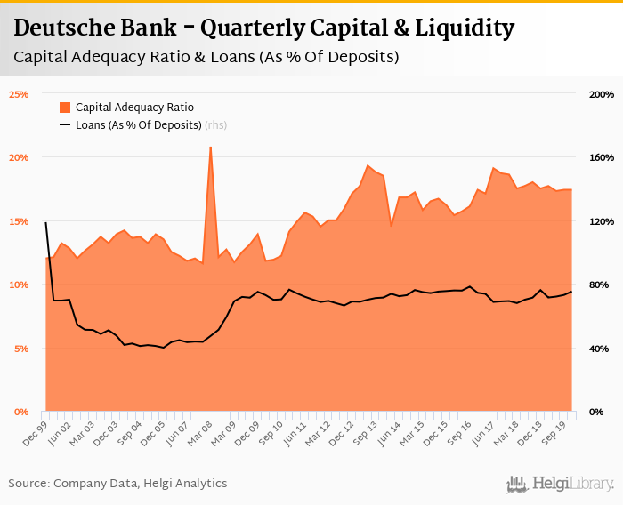 Deutsche Bank's capital adequacy ratio reached 17.4% at the end of fourth quarter of 2019, down from 17.4% when compared to the previous quarter. Historically, the bank’s capital ratio hit an all time high of 20.8% in 1Q2008 and an all time low of 11.6% in 4Q2007.