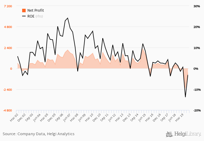 The bank generated its shareholders an average return on equity of 1.34% in the last five years with maximum at 11.8% and minimum at -13.8%.