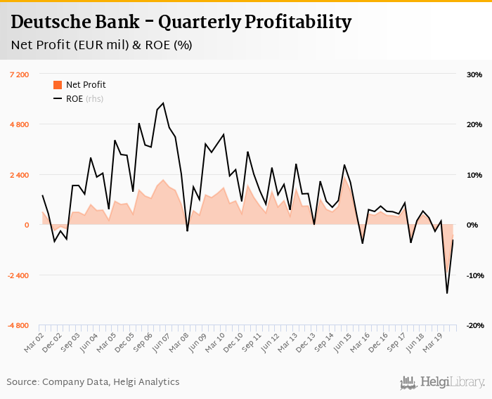 Deutsche Bank made a net profit of EUR -496 mil in the third quarter of 2019, down 322% when compared to the same period of last year. This implies a return on equity of -3.06%.