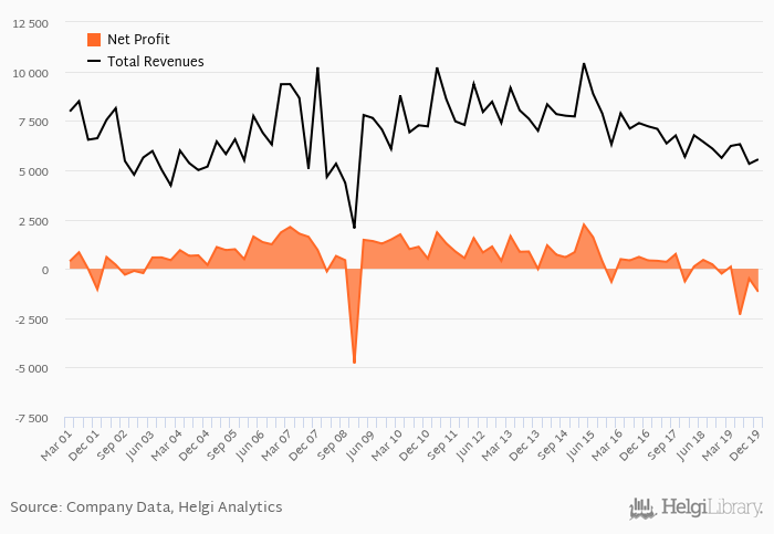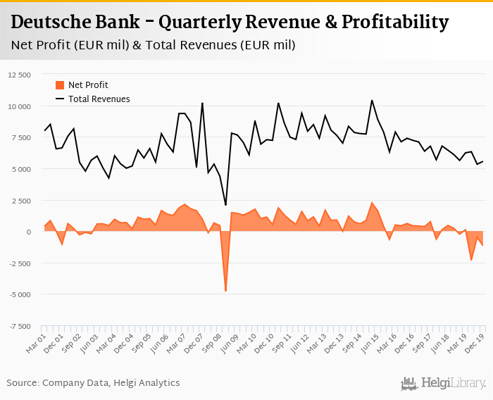 Deutsche Bank made a net profit of EUR -1,165 mil under revenues of EUR 5,548 mil in the fourth quarter of 2019, down 378% and 1.28% respectively when compared to the same period last year.