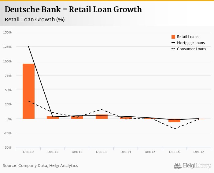 Deutsche Bank's retail loans reached EUR 186,729 mil at the end of 2017-12-31, down 0% compared to the previous year. In the last decade, the average annual loan growth amounted to 0%.