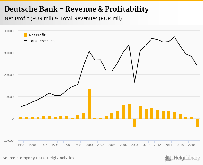 Deutsche Bank made a net profit of EUR -3,674 mil under revenues of EUR 23,862 mil in 2019, up -564% and -15.1% respectively compared to the previous year.
