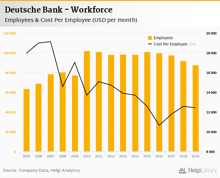 Deutsche Bank employed 87,597 persons in 2019, down 4.51% when compared to the previous year. Historically, the bank's workforce hit an all time high of 102,062 persons in 2010 and an all time low of 63,427 in 2005.