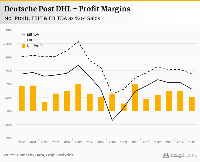 Deutsche Post DHL made a net profit of EUR 1,540 mil with revenues of EUR 59,230 mil in 2015, down by 25.6% and up by 4.59%, respectively, compared to the previous year.