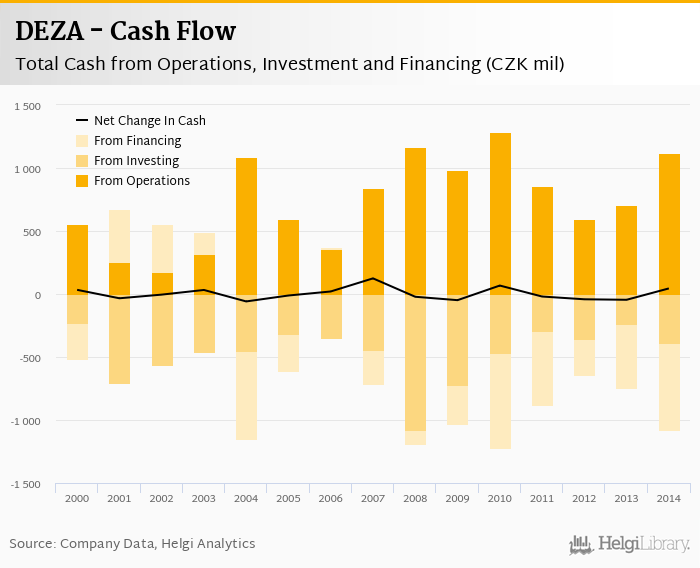 DEZA's operating cash flow stood at CZK 1,120 mil in 2014, up 59.4% when compared to the previous year. Historically, between 2000 - 2014, the firm’s operating cash flow reached a high of CZK 1,288 mil in 2010 and a low of CZK 177 mil in 2002.