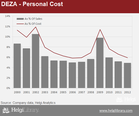 The Company has increased its sales and profits five-fold in the last decade. In 2012, sales reached nearly CZK 10 bil and net profit amounted to CZK 750 mil. Deza is little indebted (net debt amounted to 25% of total equity at the end of 2012) and impressively profitable (with ROE of 20-30% in 2010-2012).