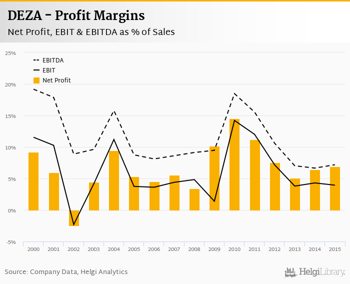 DEZA made a net profit of CZK 542 mil with revenues of CZK 7,831 mil in 2015, down by 16.7% and down by 22.5%, respectively, compared to the previous year.