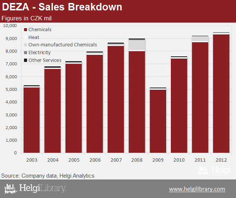 The Company has increased its sales and profits five-fold in the last decade. In 2012, sales reached nearly CZK 10 bil and net profit amounted to CZK 750 mil. Deza is little indebted (net debt amounted to 25% of total equity at the end of 2012) and impressively profitable (with ROE of 20-30% in 2010-2012).