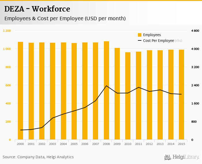 DEZA employed 991 employees in 2015, up 0.202% compared to the previous year. Historically, between 2000 and 2015, the firm's workforce hit a high of 1,081 employees in 2008 and a low of 963 employees in 2010.