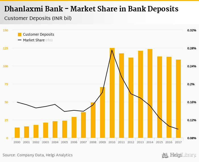 Dhanlaxmi Bank's customer deposits reached INR 109 bil in 2017, down 3.31% compared to the previous year.