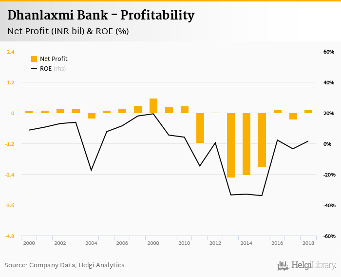 Dhanlaxmi Bank made a net profit of INR 0.117 bil in 2018, up 147% compared to the previous year. This implies a return on equity of 1.54%.