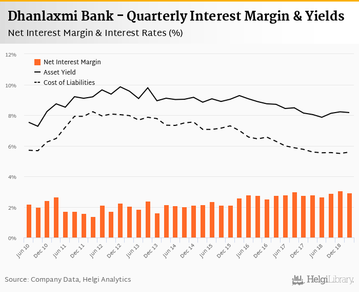Dhanlaxmi Bank's net interest margin amounted to 2.94% in the first quarter of 2019, down from 3.06% when compared to the previous quarter.