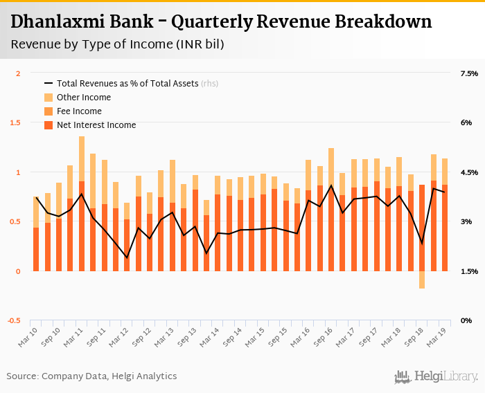 Dhanlaxmi Bank generated total banking revenues of INR 1.14 bil in the first quarter of 2019, down 1.13% when compared to the same period of last year and 3.53% when compared to the previous quarter.