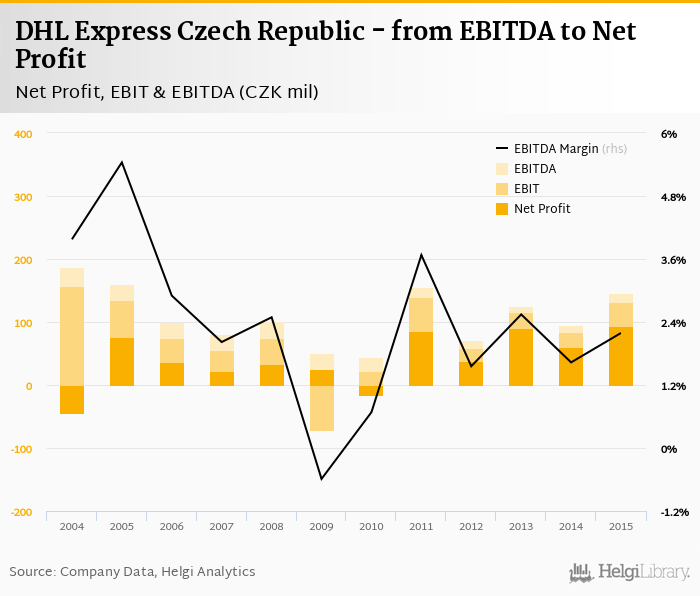 DHL Express Czech Republic made a net profit of CZK 94.1 mil with revenues of CZK 6,694 mil in 2015, up by 57.9% and up by 15%, respectively, compared to the previous year. This translates into a net margin of 1.41%.