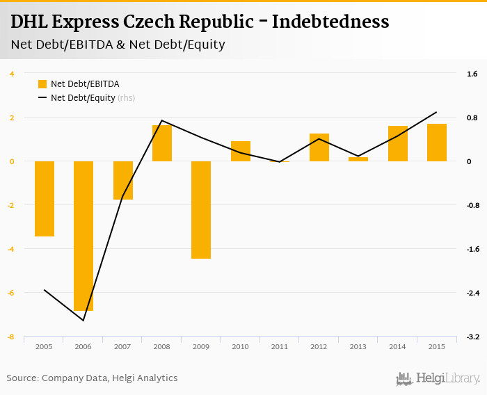 DHL Express Czech Republic's net debt stood at CZK 253 mil and accounted for 0.889 of equity at the end of 2015. The ratio is up 0.440 pp compared to the previous year.
