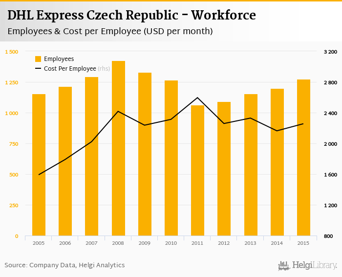 DHL Express Czech Republic employed 1,275 employees in 2015, up 6.52% compared to the previous year. Historically, between 2005 and 2015, the firm's workforce hit a high of 1,425 employees in 2008 and a low of 1,062 employees in 2011.