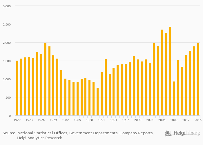 Historically, diamond production in Namibia reached an all time high of 2,435 '000 ct in 2008 and an all time low of 763 '000 ct in 1990. When compared to Namibia's main peers, diamond production in Angola amounted to 9,016 '000 ct, 20,824 '000 ct in Botswana, 8,233 '000 ct in South Africa and 3,491 '000 ct in Zimbabwe in 2015.