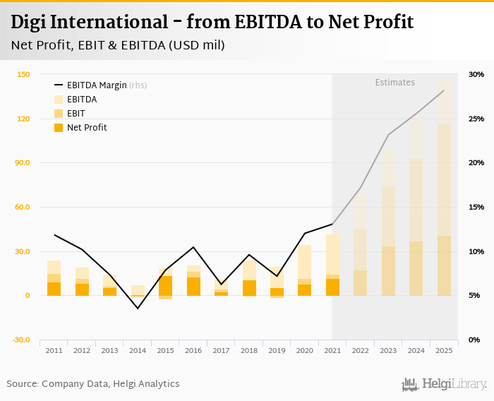 Digi International made a net profit of USD 11.9 mil with revenues of USD 320 mil in 2021, up by 50.2% and up by 10.2%, respectively, compared to the previous year. This translates into a net margin of 3.71%.