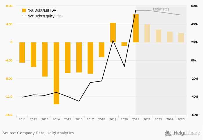 Historically, the firm’s net debt to equity reached a high of 54.9% in 2021 and a low of -45.1% in 2016 between 2011 and 2021. The average for the last five years was 4.56%.