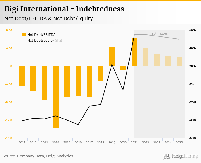 Digi International's net debt stood at USD 260 mil and accounted for 54.9% of equity at the end of 2021. The ratio is up 61.6 pp compared to the previous year.