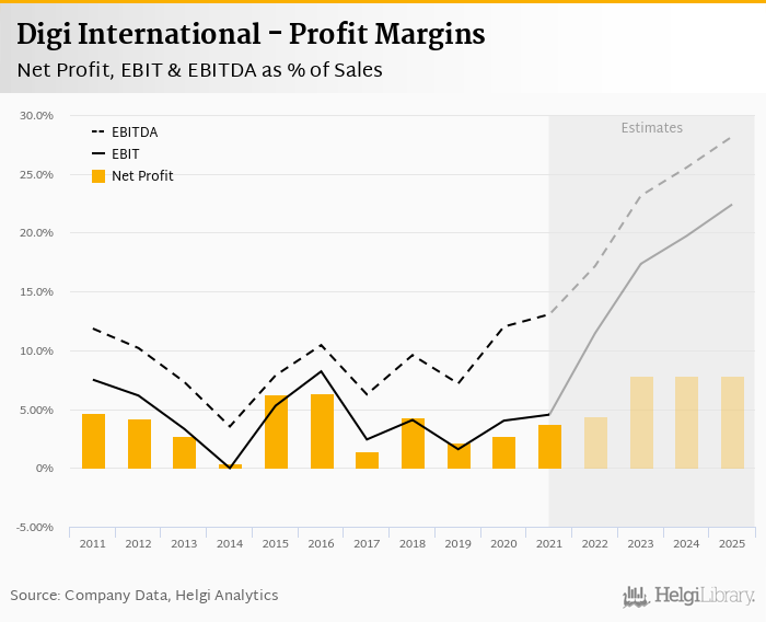 Digi International made a net profit of USD 11.9 mil with revenues of USD 320 mil in 2021, up by 50.2% and up by 10.2%, respectively, compared to the previous year.