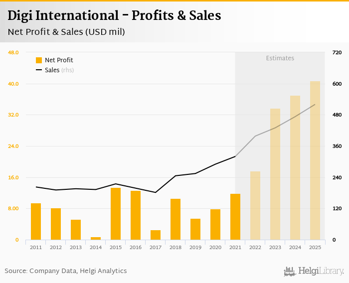 Digi International made a net profit of USD 11.9 mil in 2021, up 50.2% compared to the previous year. Total sales reached USD 320 mil, which is up 10.2% when compared to the previous year.