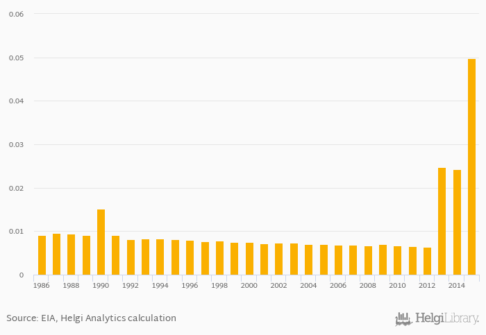 Distillate fuel oil consumption as a share of worldwide consumption rose 105% to 0.050% in Guinea in 2015, according to EIA.
