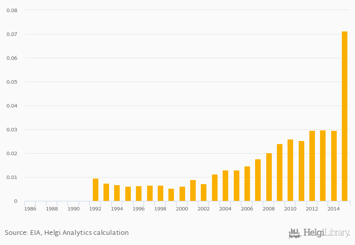 Distillate fuel oil consumption as a share of worldwide consumption rose 142% to 0.071% in Congo in 2015, according to EIA.