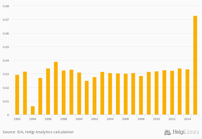 Distillate fuel oil consumption as a share of worldwide consumption rose 117% to 0.073% in Macedonia in 2015, according to EIA.