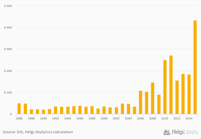 Distillate fuel oil consumption as a share of worldwide consumption rose 136% to 0.434% in Qatar in 2015, according to EIA.