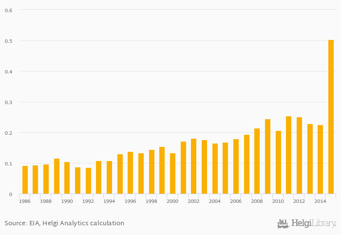 Distillate fuel oil consumption as a share of worldwide consumption rose 124% to 0.504% in Bangladesh in 2015, according to EIA.