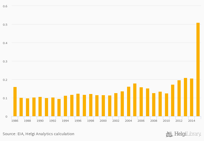 Distillate fuel oil consumption as a share of worldwide consumption rose 147% to 0.509% in Jordan in 2015, according to EIA.