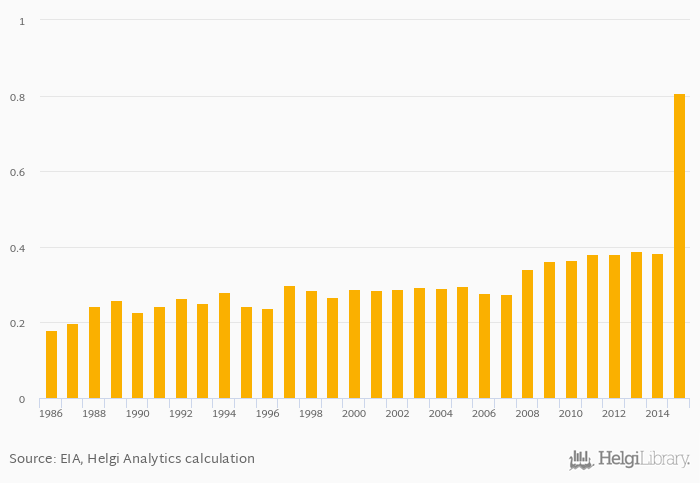 Distillate fuel oil consumption as a share of worldwide consumption rose 111% to 0.807% in Morocco in 2015, according to EIA.