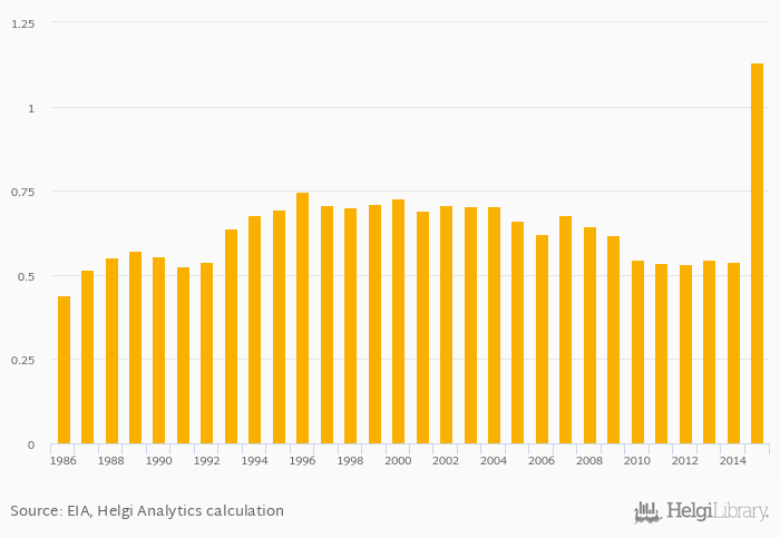 Distillate fuel oil consumption as a share of worldwide consumption rose 110% to 1.13% in Pakistan in 2015, according to EIA.