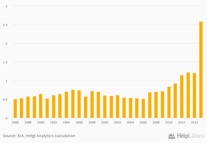 Distillate fuel oil consumption as a share of worldwide consumption rose 115% to 2.59% in Iraq in 2015, according to EIA.