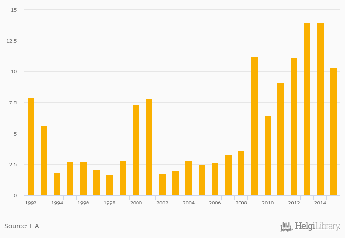 Historically, distillate fuel oil consumption in Kyrgyzstan reached an all time high of 14.0 '000 bpd in 2014 and an all time low of 1.66 '000 bpd in 1998. When compared to Kyrgyzstan's main peers, distillate fuel oil consumption in China amounted to 3,514 '000 bpd, 78.0 '000 bpd in Kazakhstan, 5.07 '000 bpd in Tajikistan and 18.0 '000 bpd in Uzbekistan in 2015.