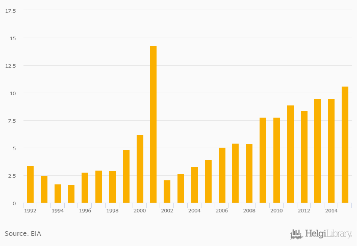 Distillate fuel oil consumption rose 11.7% to 10.6 '000 bpd in Georgia in 2015, according to EIA.