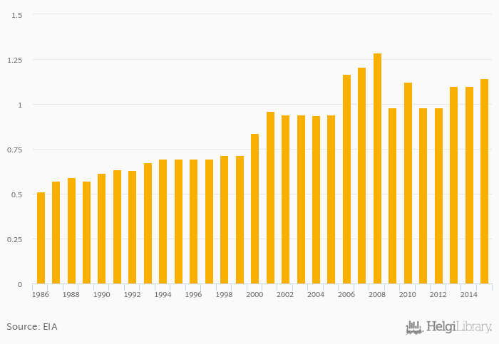 Distillate fuel oil consumption rose 4.05% to 1.14 '000 bpd in Gambia in 2015, according to EIA.