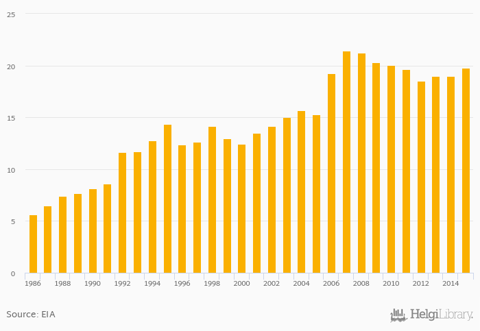 Distillate fuel oil consumption rose 4.13% to 19.8 '000 bpd in Costa Rica in 2015, according to EIA.