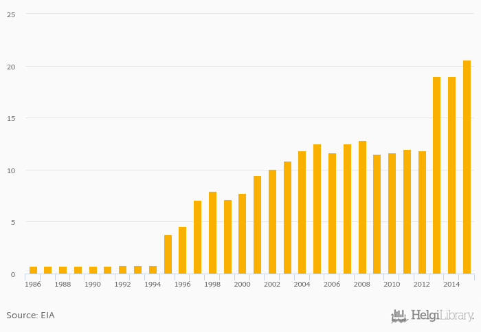 Distillate fuel oil consumption rose 8.11% to 20.5 '000 bpd in Cambodia in 2015, according to EIA.
